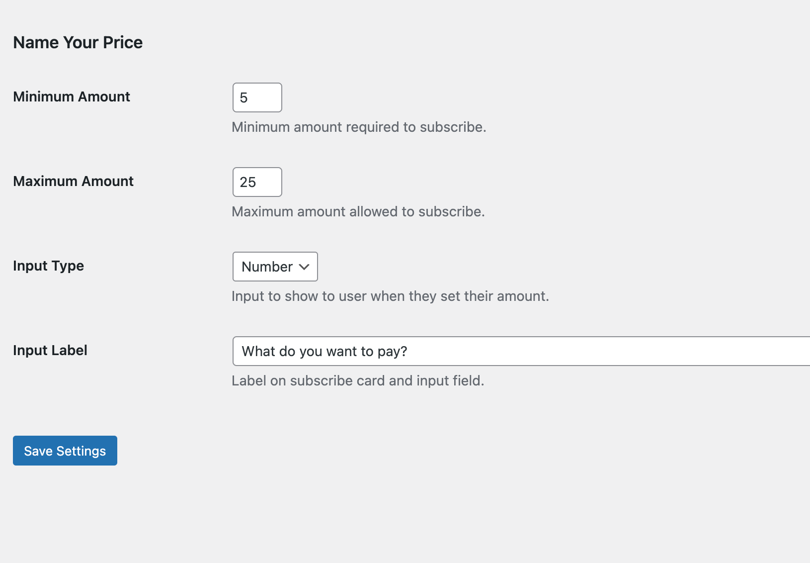 1. Configure your settings under Leaky Paywall > Settings > Subscriptions > Name Your Price.