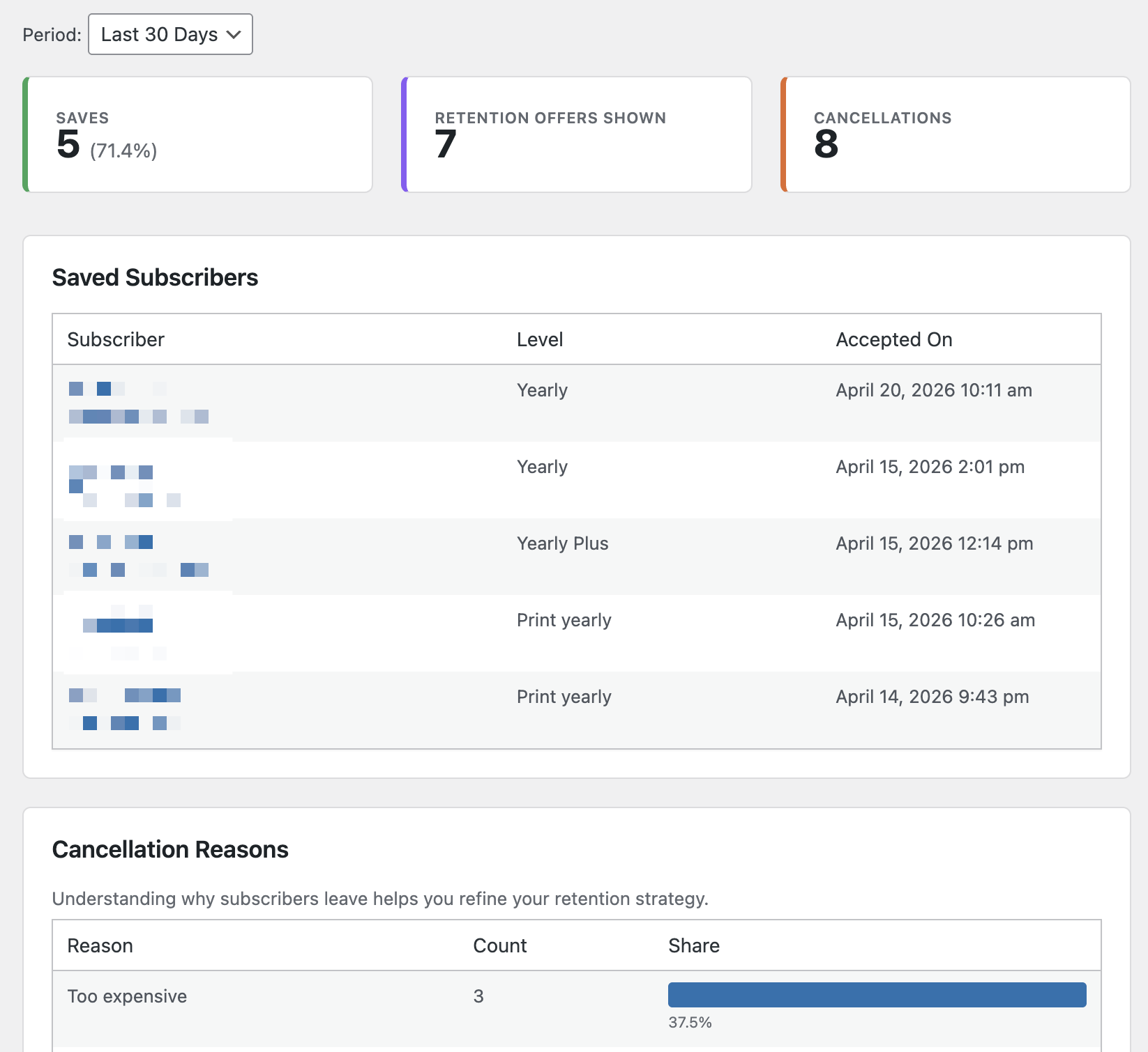 - Review the Retention page monthly. A healthy save rate is 10-20% of subscribers who see the offer.